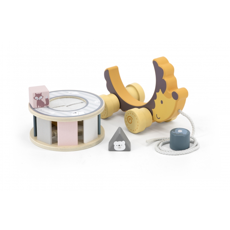 – Setul este format dintr-un arici pe un cordon de tracțiune, un sortator detașabil, 4 cuburi de lemn în formă de cerc, pentagon, pătrat și triunghi