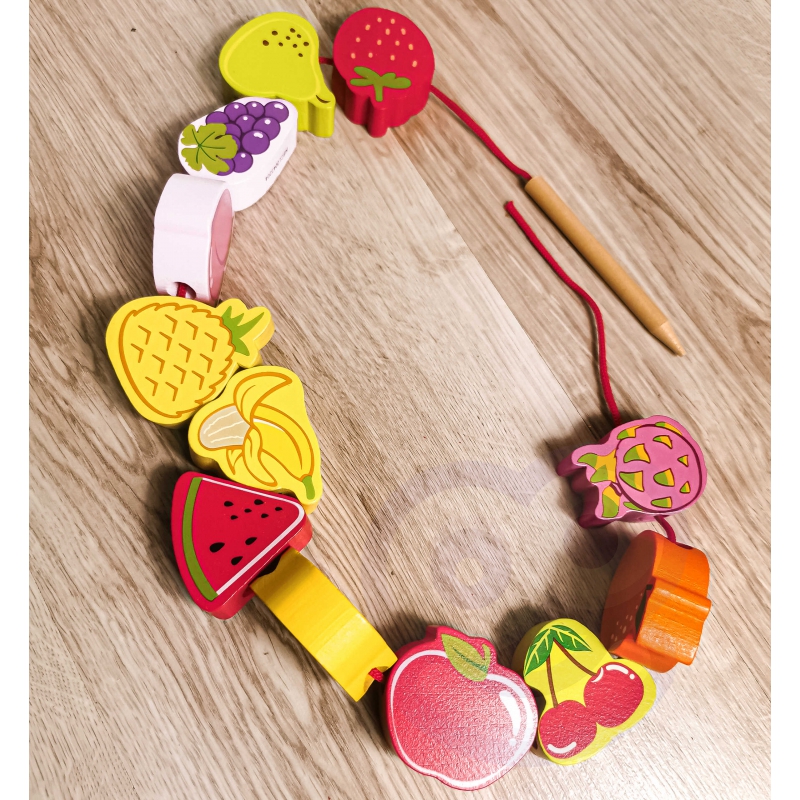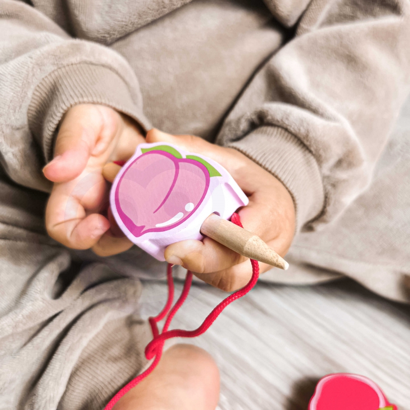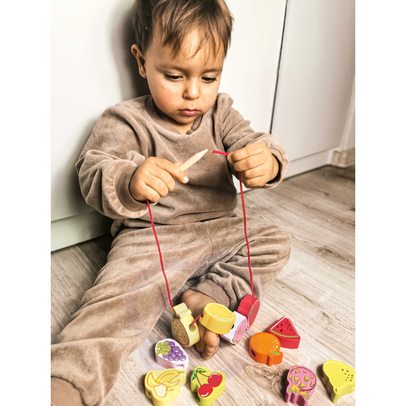 O sfoară din lemn cu fructe este jucăria perfectă pentru cei mai tineri exploratori ai noștri. Setul este format din 12 blocuri de lemn în formă de fructe, care sunt înșirate pe o sfoară printr-un ac de lemn. Datorită acestei jucării, copilul își va dezvolta abilitățile motorii și își va îmbogăți imaginația. Jucăria are, de asemenea, scopul de a-l învăța pe copil numele fructelor și culorile acestora. Setul va stimula curiozitatea copilului mic și îi va oferi ore întregi de distracție – blocurile pot fi aranjate în orice mod.