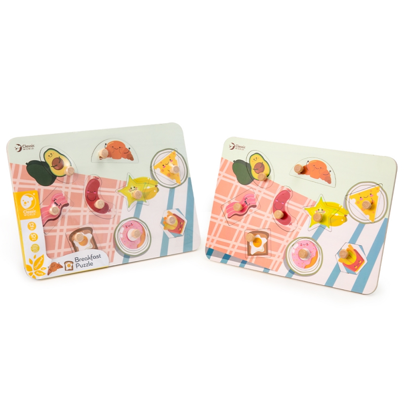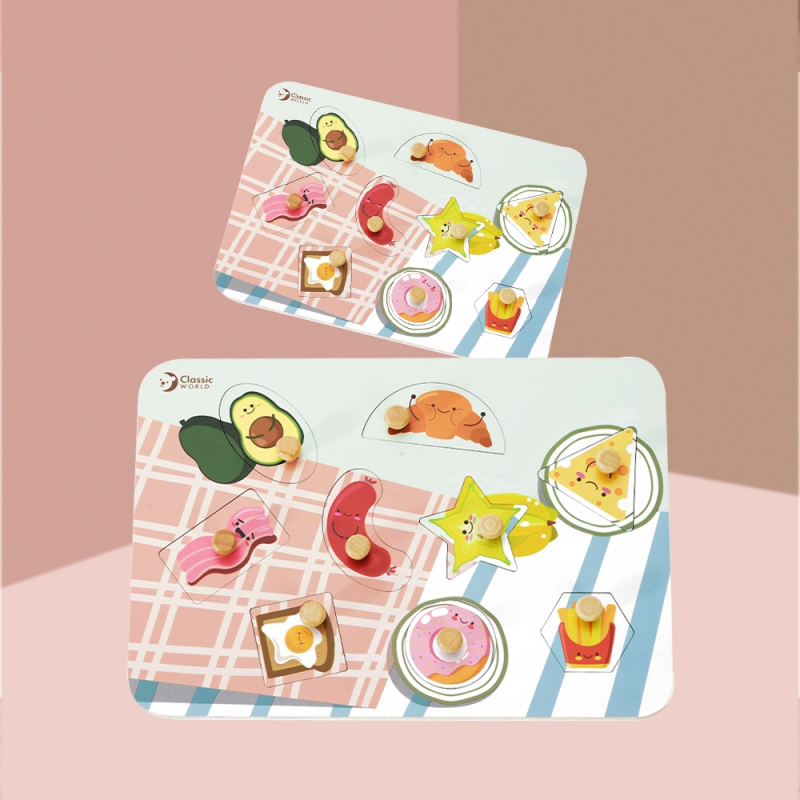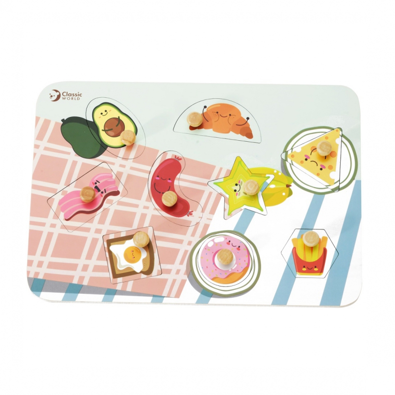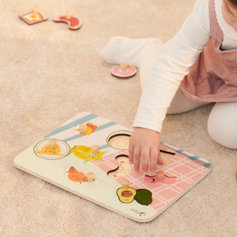 – puzzle-ul cu ace cu temă alimentară este o jucărie excelentă pentru copiii cu vârsta de 18 luni și mai mult