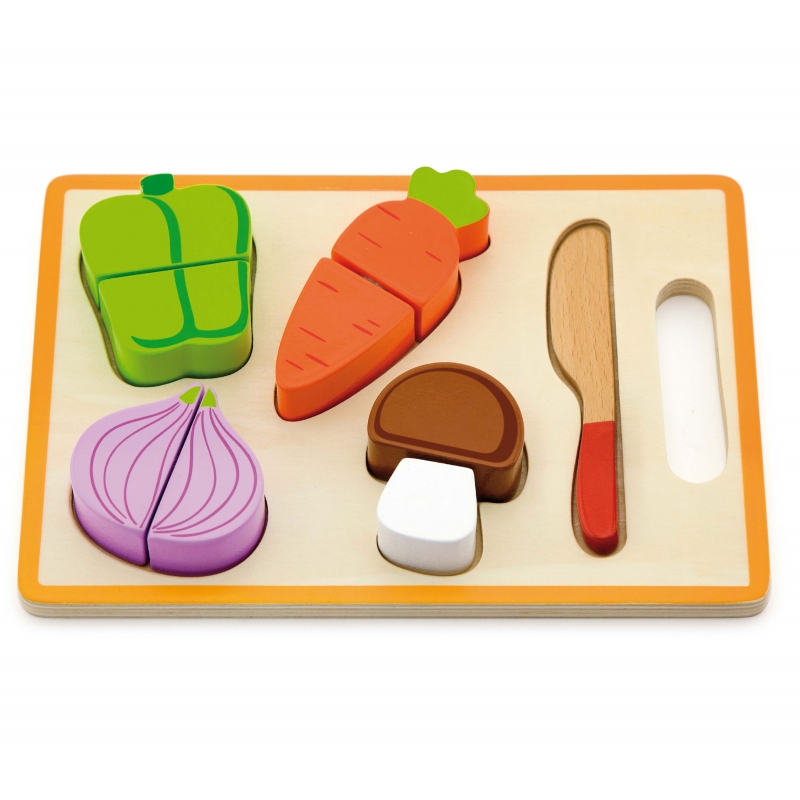 Copiii care sunt deosebit de pasionați să urmărească ceea ce se întâmplă în bucătărie pot încerca placa de legume din lemn, ale cărei părți sunt conectate prin Velcro. Datorită utilizării Velcro-ului, se creează o rezistență, la fel ca în cazul felierii reale. După ce ați feliat, pur și simplu pliați leguma și puteți începe distracția din nou.