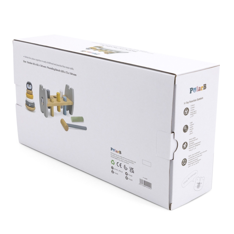 Acest set include două jucării din lemn în culori pastelate: o piramidă educativă și un perforator cu ciocan. Ambele jucării nu numai că vor umple timpul copilului dumneavoastră cu multă distracție, dar vor contribui și la dezvoltarea abilităților motorii, a gândirii logice și la învățarea culorilor. Petrecându-și timpul cu aceste jucării, copilul dvs. va dobândi mișcări precise ale mâinilor care vor facilita învățarea scrisului în viitor.