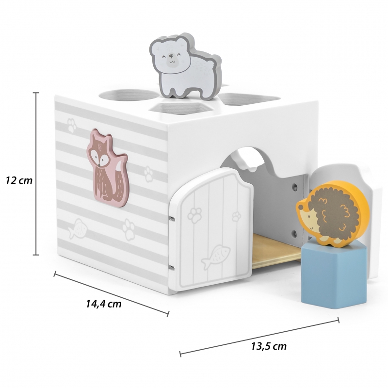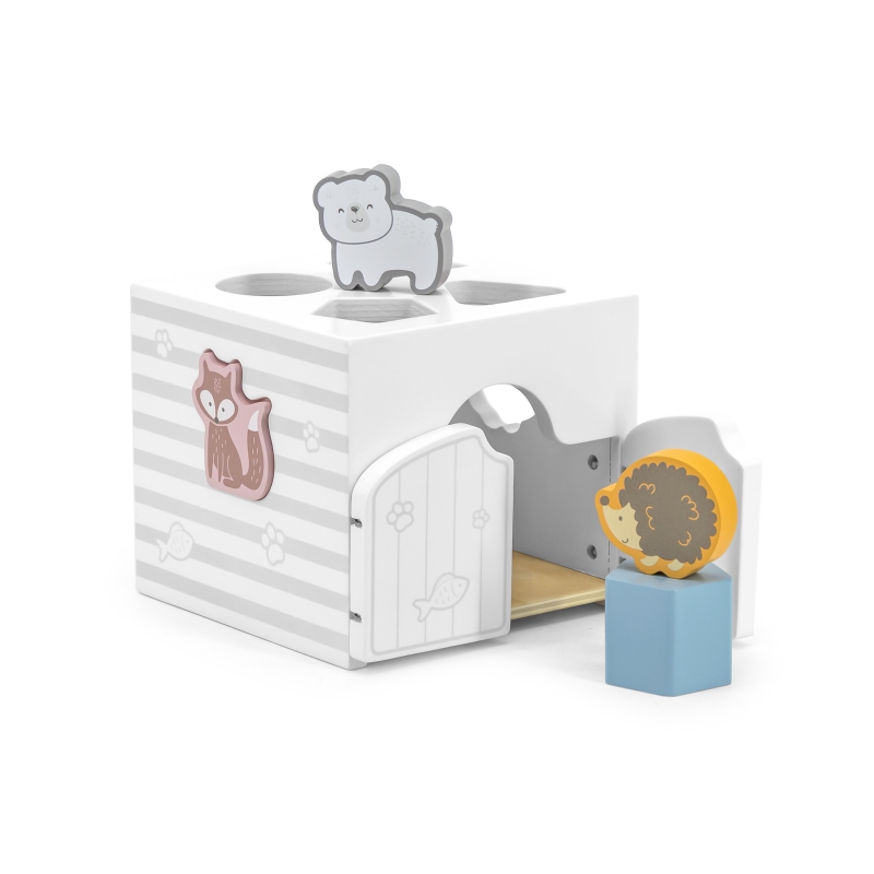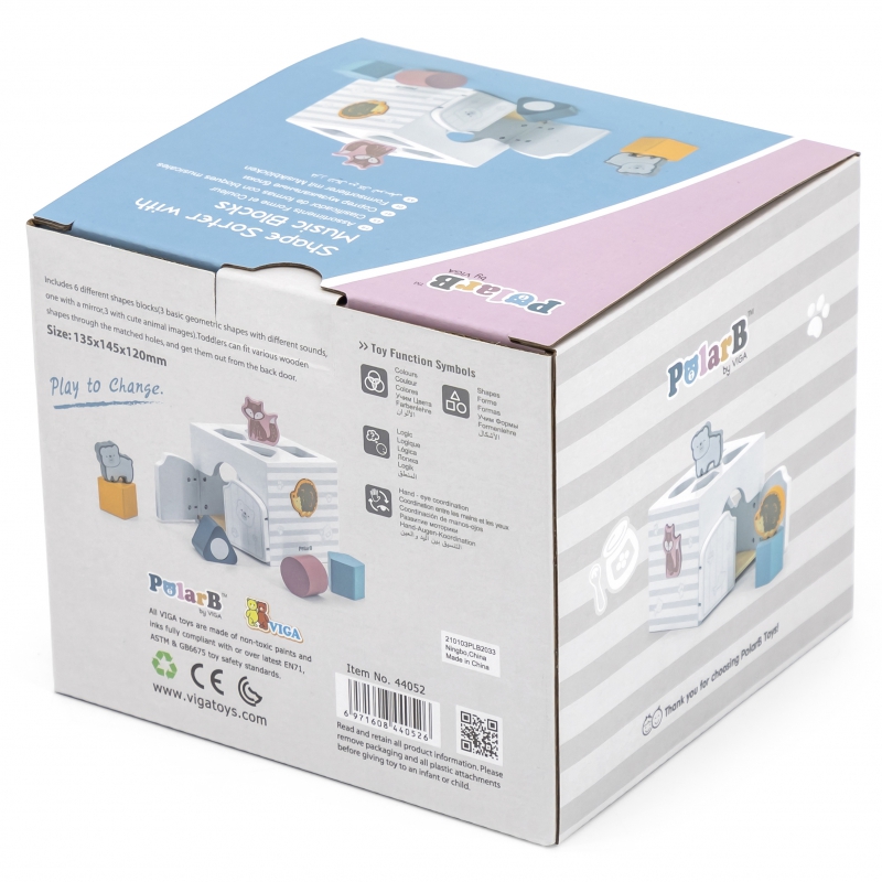 – conține 7 blocuri de diferite forme – 3 forme geometrice de bază cu diferite sunete, 3 în formă de animale cu desenele lor și unul cu oglindă